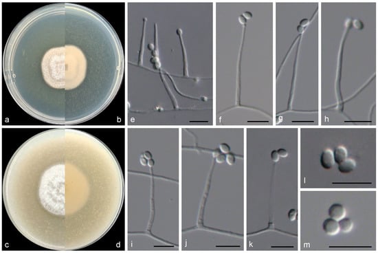 Morphological characters of Verruciconidia oligospora (from ex-type WL05964). (a–d) Colonies on PDA and OA after 7 d; (e–k) conidiophores and conidiogenous cells; (l,m) conidia. Bars: (e–m) = 10 μm.