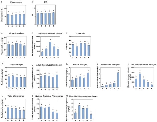 Physicochemical properties and nutrient contents of the substrate at different stages. (a) Water content; (b) pH; (c) organic carbon; (d) microbial biomass carbon; (e) C/N ratio; (f) total nitrogen; (g) alkali-hydrolyzed nitrogen; (h) nitrate nitrogen; (i) ammonium nitrogen; (j) microbial biomass nitrogen; (k) total phosphorus; (l) quickly available phosphorus; (m) microbial biomass phosphorus. A, B, C, D, and E represent the needle stage, the button stage, the egg stage, the elongation stage, and the maturation stage, respectively. Different letters indicate statistically significant differences.