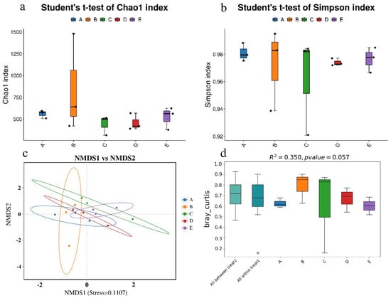 Alpha diversity and beta diversity of the substrate at different stages. (a) Alpha diversity based on the Chao1 index; (b) alpha diversity based on the Simpson index; (c) nonmetric multidimensional scaling analysis for the bacterial communities based on the Bray–Curtis similarity index; (d) PERMANOVA for the bacterial communities based on the Bray–Curtis similarity index. A, B, C, D, and E represent the needle stage, the button stage, the egg stage, the elongation stage, and the maturation stage, respectively.