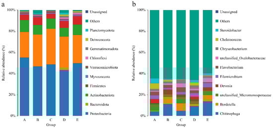 Further differences in the bacterial community structure were detected at the phylum (Figure 3a) and genus (Figure 3b) levels. At the phylum level, the dominant phyla across the 5 stages were relatively consistent, with Proteobacteria consistently being the most abundant (relative abundance 43.40–55.07%). The relative abundances of Bacteroides, Actinobacteria, and Firmicutes followed, with relative abundances of 24.61–33.64%, 8.11–11.22%, and 4.33–7.89%, respectively. Among these, the trends for Proteobacteria and Actinobacteria were similar, with their relative abundances peaking in stage A and reaching their lowest values in stage D. In contrast, the abundances of Bacteroidota and Firmicutes peaked in stages C and E, respectively.