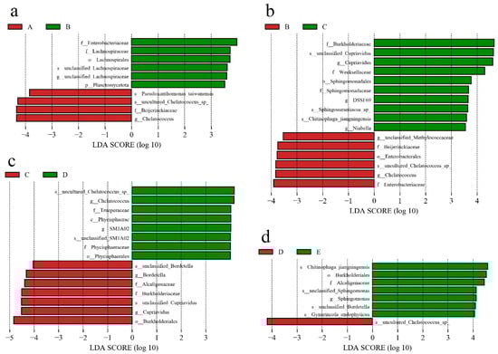 Taxonomic differences among substrate bacteria at different stages were determined via the linear discriminant analysis (LDA) effect size (LEfSe) method, and the LDA threshold was 3.0. (a) stage A vs. stage B; (b) stage B vs. stage C; (c) stage C vs. stage D; and (d) stage D vs. stage E. The X-axis represents the LDA score, and the greater the LDA score is, the greater the contribution of the taxon to differences between groups. The Y-axis lists different taxa, from genus to phylum, including unclassified taxa (such as unclassified taxa). A, B, C, D, and E represent the needle stage, the button stage, the egg stage, the elongation stage, and the maturation stage, respectively.