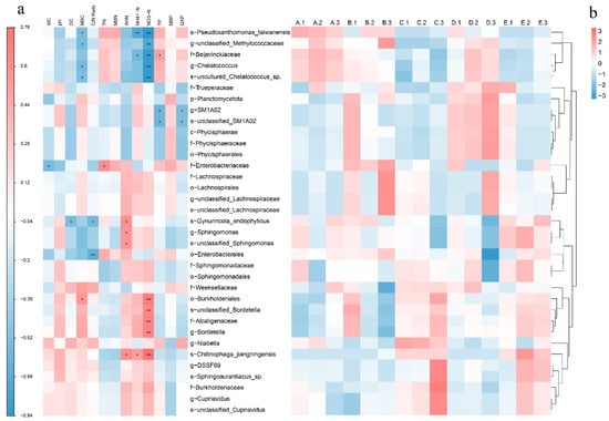 Heatmap of the relative abundance of different bacterial taxa (a) and correlation analysis between nutritional components and different bacterial taxa (b) in the substrate at different stages. Red and blue indicate positive and negative correlations, respectively. The intensity of the color represents the strength of the correlation, with darker shades signifying stronger associations. The analysis was conducted via Spearman’s correlation coefficient, and statistical significance is indicated by asterisks (* for p < 0.05, ** for p < 0.01). A, B, C, D, and E represent the needle stage, the button stage, the egg stage, the elongation stage, and the maturation stage, respectively, and 1, 2 and 3 represent the three repetitions for each stage.