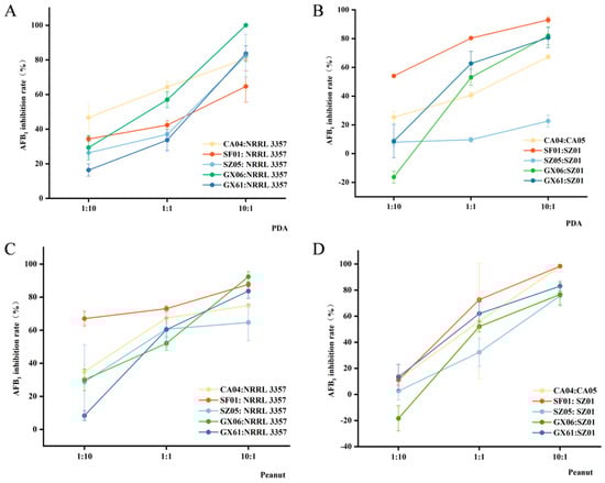 3.4. Atoxigenic A. flavus Significantly Inhibits the Production of Aflatoxins