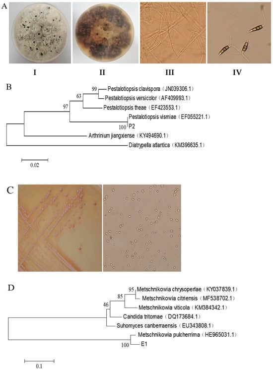 (A): Morphological characteristics of strain P2 and strain E1. (I) Colony morphology of P2 on the front of a PDA plate; (II) colony morphology of P2 on the back of a PDA plate; (III) image of mycelia of P2; (IV) image of conidia of P2. (B): Molecular evolutionary tree of P2 (SAMN49174010). The phylogenetic tree was constructed by the neighbor-joining method using MEGA 5.1 software. The bootstrap values are shown at the branch points. (C): Colony (left) and cell (right) morphology of strain E1. (D): Molecular evolutionary tree of Metschnikowia pulcherrima E1(SAMN49174009). The phylogenetic tree was constructed by the neighbor-joining method using MEGA 5.1 software. The bootstrap values are shown at the branch points.