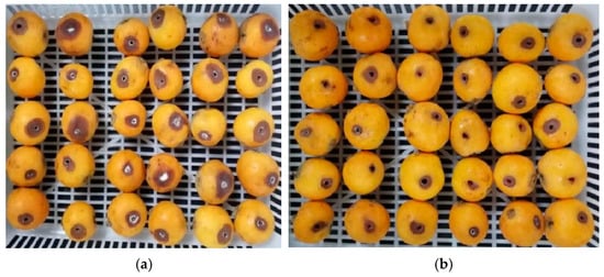 Effect of M. pulcherrima E1 on the decay rate of gray spot in loquat fruit. (a) Control group: treated with sterile water of one parallel replicate. (b) Treatment group: treated with M. pulcherrima E1 of one parallel replicate.