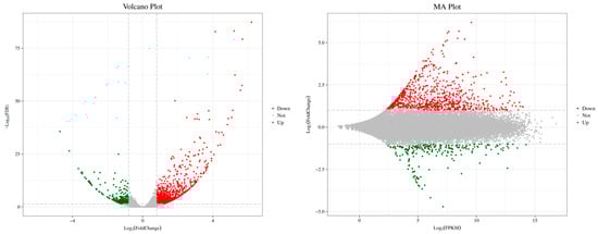 Volcano plot and MA plot of DEGs. The Volcano plot shows the relationship between the significance (Y-axis) and fold change (X-axis) of differentially expressed genes (DEGs). The MA plot displays the distribution of gene expression levels (X-axis) and fold changes (Y-axis). Green points represent downregulated DEGs, red points represent upregulated DEGs, and black points represent non-differentially expressed genes.