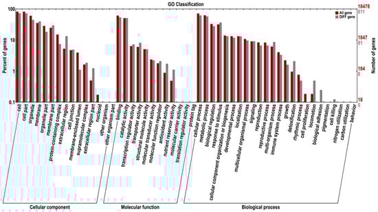 Classification of DEGs based on GO annotation. DIFF gene: differentially expressed gene (DEG), defined as genes with |log2(FC)| ≥ 0.8 and FDR < 0.05.