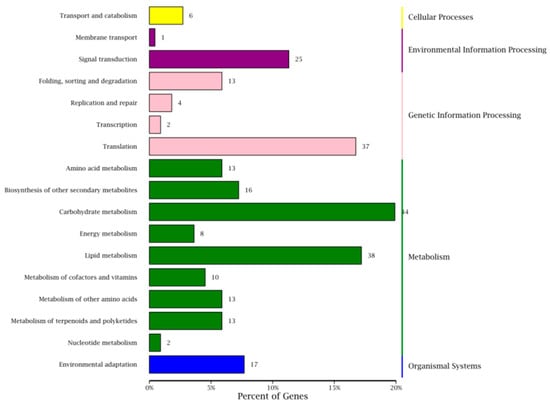 KEGG enrichment analysis was performed to investigate the biological pathways and functional networks associated with the differentially expressed genes (DEGs). The analysis revealed that 221 DEGs participated in 86 distinct metabolic pathways. As shown in Figure 5, these DEGs were primarily enriched in five major functional categories: genomic processes, cellular processes, basic metabolic processes, biological systems, and environmental information processing. These primary categories could be further divided into 17 secondary metabolic pathways. The genomic processes category encompassed DNA replication and repair, translation, and transcription. Cellular processes mainly involved transport and catabolism activities, while environmental information processing included membrane transport and signal transduction. Basic metabolic processes covered lipid metabolism, biosynthesis of secondary metabolites, and metabolism of various amino acids. The biological systems category was primarily associated with environmental adaptation functions. Among all identified pathways, the five most significantly enriched KEGG pathways were zein biosynthesis, stilbene/diarylheptane/gingerol biosynthesis, riboflavin metabolism, and plant–pathogen interaction.