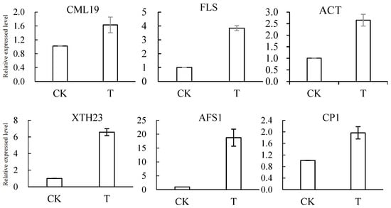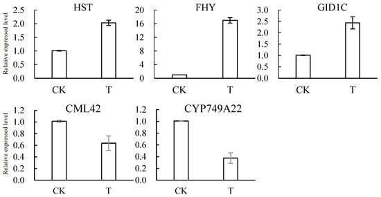 RT–qPCR was used to verify the expression levels of the DEGs related to plant resistance, as shown in Figure 6. The vast majority of DEGs are upregulated at expression levels, including CML19 (59.8%), FLS (280%), ACT (162.3%), XTH23 (551.5%), AFS1 (175.6%), CP1 (95%), HST (101%), FHY (158.4%), and GID1C (141.6%). The expression levels of CML42 and CYP74A22 were downregulated by 36.6% and 62.4%, respectively, which was basically consistent with the results of transcriptome analysis.