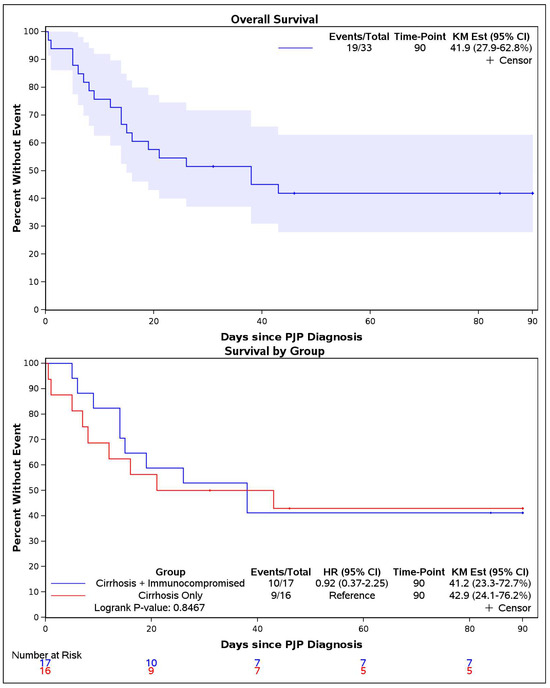 | 90-Day Mortality | 19 (57.6%) | 9 (56.3%) | 10 (58.8%) | 1.00 |