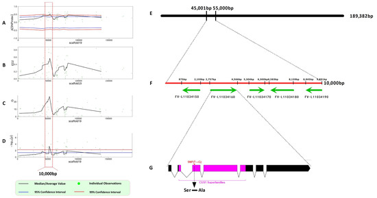 A total of 24 DNAs were selected from the two types of monokaryotic strains (fruiting and non-fruiting) and pooled separately. Whole-genome resequencing was performed on DNA extracted from the two bulked pools, including the monokaryotic fruiting FF002-F and the monokaryotic non-fruiting FF002-N, as well as two parental strains (FF002-PL-30F and FF002-PL-8N). Genomic DNA was sonicated, and the adapters were ligated to the fragment ends. After purification, the library was amplified for 150 bp paired-end sequencing on the Illumina X-Ten platform (Genedenovo Biotechnology Co., Ltd., Guangzhou, China). After removing the adapters and low-quality reads, the clean reads from each sample were aligned against the FV-L11 genome [29] using the Burrows–Wheeler Aligner (0.7.17) [30]. Then, alignment files were converted to BAM format using SAMtools (1.22) [31]. Variant calling was identified using the Genome Analysis Toolkit3 (3.8-1) [32], followed by single-nucleotide polymorphisms (SNPs) or insertion/deletion polymorphisms (InDels) annotation using ANNOVAR (http://annovar.openbioinformatics.org, accessed on 12 January 2025) [33]. Association analysis was performed using the SNP-index [34], Δ(SNP-index) [17], calculation of G statistic [35], Euclidean distance (ED) [36], and two-tailed Fisher exact test [37] based on the SNPs. Finally, the overlapping interval of the four methods was considered the final QTL interval.