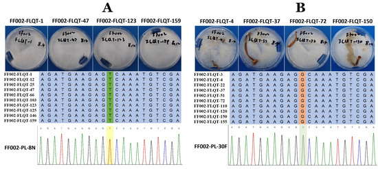 Validation of the FV-L110034160 gene of fruiting and non-fruiting monokaryotic strains. (A) Morphological characteristics and DNA sequences near the mutation site of non-fruiting monokaryotic strains in the genetic population, alongside sequencing chromatograms of the mutation site in non-fruiting monokaryotic parental strain FF002-PL-8N used for population construction (in the genetic population, the phenotype of monokaryotic non-fruiting strains consistently exhibits a T base at the mutation site, identical to the monokaryotic non-fruiting parental strain); (B) morphological characteristics and DNA sequences near the mutation site of fruiting monokaryotic strains in the genetic population, alongside sequencing chromatograms of the mutation site in fruiting monokaryotic parental strain FF002-PL-30F used for population construction (in the genetic population, the phenotype of monokaryotic fruiting strains consistently exhibits a G base at the mutation site, identical to the monokaryotic fruiting parental strain).