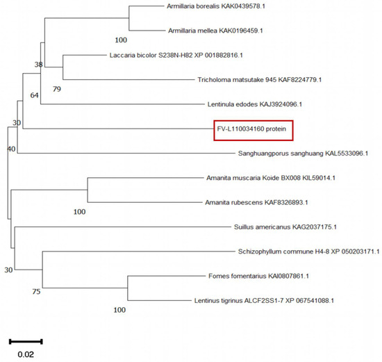 Phylogenetic analysis of the FV-L110034160 gene revealed distinct evolutionary patterns. The protein showed high conservation among species within the same genus, such as Armillaria borealis and Armillaria mellea within the genus Armillaria, as well as Amanita muscaria and Amanita rubescens within the genus Amanita. However, significant divergence was observed at taxonomic levels above the genus, particularly between F. filiformis and Lentinula edodes (Figure 5). The conservation of such genes among edible fungi species suggested their important roles in the development of the fruiting body.