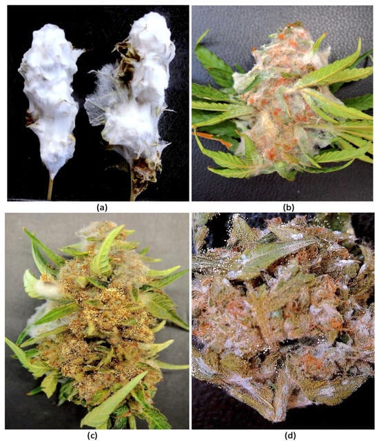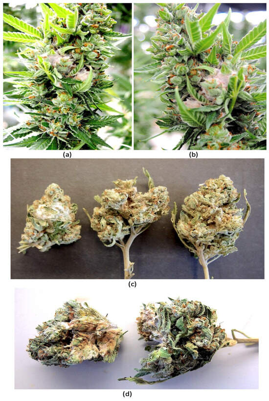 Figure 1a,b). Samples of dried cannabis inflorescences after the drying process was completed and before packaging had occurred also showed evidence of infection. These samples showed pinkish-white mycelial growth indicative of the presence of a