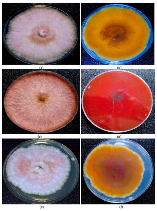 Figure 2a,b). The second type was represented by fast-growing red-pigmented colonies with some aerial mycelia (