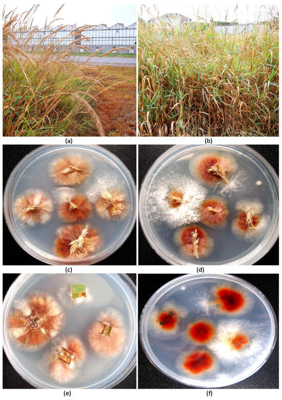 Figure 2a,b). Samples of inflorescences and leaves were obtained from these plants at random and surface-sterilized as above and plated onto PDA+S and select fungal colonies were transferred to fresh medium after 5–7 days. The weather conditions during sampling were overcast skies with a light drizzle and a temperature of 18 °C.
