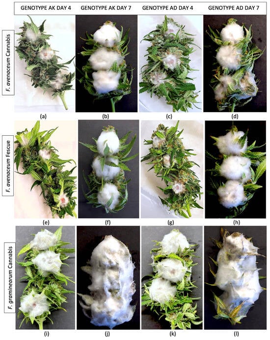 F. graminearum, extensive mycelial growth was observed after 4 and 7 days on each of the two cannabis genotypes (AK, AD) due to the high humidity conditions within the sealed plastic containers (