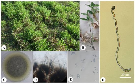 Field symptoms and morphological characteristics of Colletotrichum tofieldiae (LYZ0664). (A,B) Field symptoms. (C) Colony on PDA after 7 days at 25 °C. (D) Acervuli and setae. (E) Conidia on PDA. (F) Appressorium.
