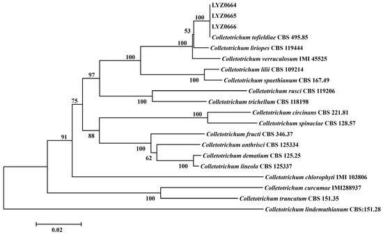 The BLAST analysis of the ITS, ACT, Tub2, CHS-1, GAPDH, and HIS3 gene sequences of LYZ0664, LYZ0665, and LYZ0666 using the NCBI database revealed the high similarity (>99.8%) of the six DNA sequences to C. tofieldiae. LYZ0664, LYZ0665, LYZ0666, and C. tofieldiae (CBS 495.85) clustered on the same branch, demonstrating a 100% genetic relationship (Figure 2). The strains were identified as C. tofieldiae based on a multi-locus phylogenetic analysis.