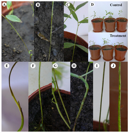Inoculation symptoms. (A–D) Koch’s postulates of Colletotrichum tofieldiae on Vicia unijuga. (A,B) Symptoms of inoculation. (C) Control. (D) Control and infected potted plants. (E–J) Inoculation symptom of other six legumes: (E) Medicago sativa; (F) Onobrychis viciifoila; (G) V. sativa; (H) Astragalus adsurgens; (I) Trifolium pretense; (J) T. repens.