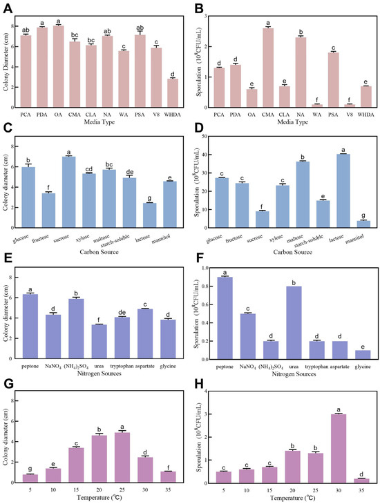 Colony growth and sporulation of Colletotrichum tofieldiae under different media types, carbon sources, nitrogen sources, and temperatures. (A) Effects of media types on colony growth; (B) Effects of media types on sporulation; (C) Effects of carbon sources on colony growth; (D) Effects of carbon sources on sporulation; (E) Effects of nitrogen sources on colony growth; (F) Effects of nitrogen sources on sporulation; (G) Effects of temperatures on colony growth; (H) Effects of temperatures on sporulation. The letters indicate a significant difference between different treatments at the p < 0.05 level.