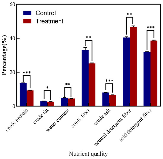 Influence on nutritional quality of Vicia unijuga inoculated with Colletotrichum tofieldiae. * indicates a significant difference between the inoculated and control groups at the p < 0.05 level; ** indicates a significant difference between the inoculated and control groups at the p < 0.01 level; *** indicates a significant difference between the inoculated and control groups at the p < 0.001 level.