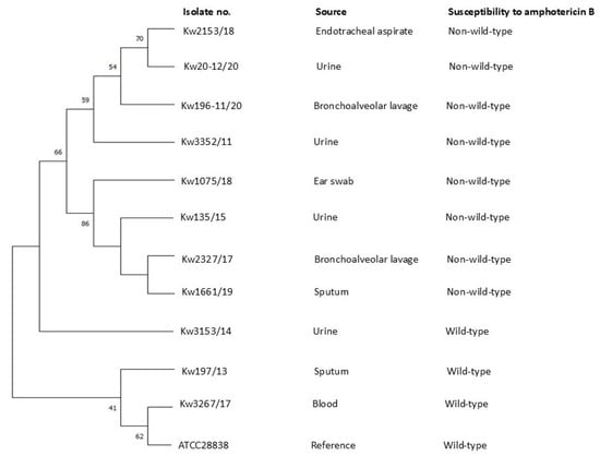 The phylogenetic relationship among C. kefyr isolates non-WT for AMB and three randomly selected WT isolates was determined by comparing concatenated sequence data of ERG2, ERG3 and ERG6 genes together with the ITS region of rDNA. The DNA sequence data from C. kefyr ATCC28838 were used as a reference. Multiple sequence alignments were performed with Clustalw muscle (https://www.ebi.ac.uk/Tools/msa/muscle/, accessed on 5 May 2025) and phylogenetic analysis was performed with Molecular Evolutionary Genetic Analysis (MEGA) version 6 software using the maximum likelihood method and bootstrap analysis with 1000 replicates, as described previously [24].