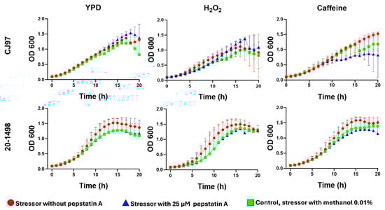3.4. Growth of C. auris CJ97 and 20-1498 in the Presence of Different Stressor Compounds