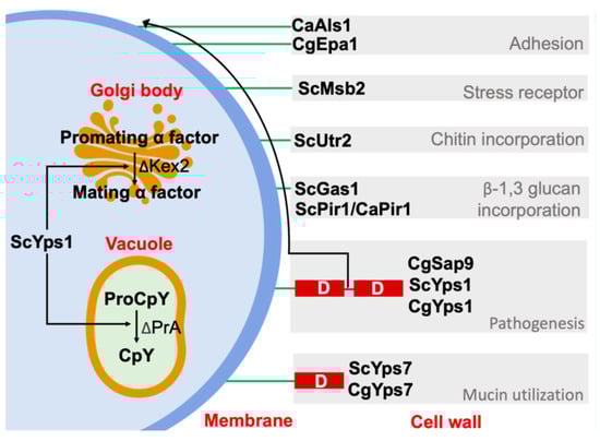 - Krysan, D.J.; Ting, E.L.; Abeijon, C.; Kroos, L.; Fuller, R.S. Yapsins are a family of aspartyl proteases required for cell wall integrity in Saccharomyces cerevisiae. Eukaryot. Cell 2005, 4, 1364–1374. [Google Scholar] [CrossRef]