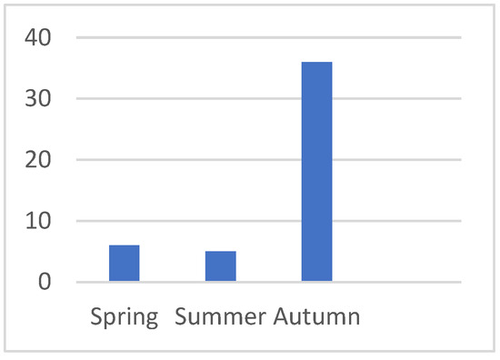 The seasonal distribution showed that 36 cases (76.59%) occurred in autumn (September–October), while 5 (10.63%) were recorded in summer and 6 (12.76%) in spring.