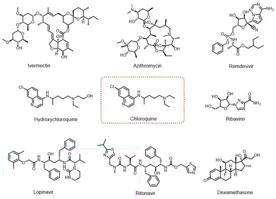 During the pandemic, numerous drugs used to treat other diseases were tested as potential therapies for COVID-19 [2], in some cases without robust scientific evidence. Among the most widely used were hydroxychloroquine [3], chloroquine [4], ivermectin [5], azithromycin [6], favipiravir [7], remdesivir [8], lopinavir–ritonavir, ribavirin, and dexamethasone [9] (Figure 1).