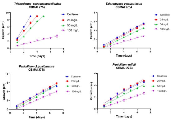 The radial growth velocity or radial growth rate (RGR) corresponds to the slope of the line obtained from linear regression of the colony radius over time. A greater slope indicates a higher RGR and, consequently, greater fungal growth potential [37]. Based on the RGR results, Talaromyces verruculosus CBMAI 2754, Penicillium cf. guaibinense CBMAI 2758, and Penicillium rolfsii CBMAI 2753 exhibited higher growth rates in medium containing 25 mg·L−1 chloroquine diphosphate compared to the control medium (absence of chloroquine diphosphate).