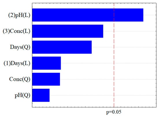 In the Pareto diagram, the length of each bar represents the magnitude of the estimated effect for each parameter, while the vertical line indicates the threshold for statistical significance at the 5% level. Within the experimental range tested, the variables that exceeded this threshold were considered statistically significant at a 95% confidence level (p < 0.05), as shown in Figure 3 [24].