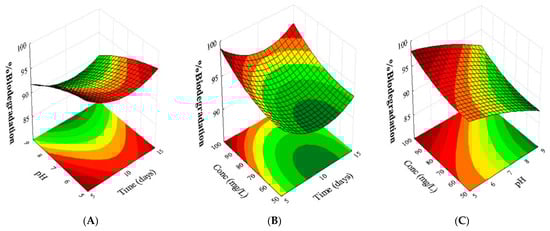 Figure 4 presents the projection of three response surface graphs used to optimize the biodegradation conditions. The quadratic model demonstrated a significant correlation between the response and the factors time, pH, and concentration. These graphs allow an analysis of the interactions between pairs of variables, providing a detailed evaluation of their combined effects on the biodegradation efficiency [41].