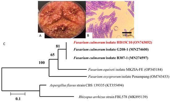Fusarium culmorum strain HD15C10: (A) 7-day-old culture at 25 °C on potato dextrose agar (PDA) medium; (B) light microscopic analysis showing the fungal elements as conidiophores and conidia; (C) molecular phylogeny of F. culmorum strain HD15C10 with DNA sequences for reference strains of F. culmorum (bar indicates genetic distance due to sequence divergence).