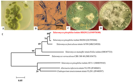 Talaromyces pinophilus strain HD25G2: (A) 7-day-old culture on PDA medium at 25 °C; (B) conidiophores with smooth walled elements, characteristically symmetrically biverticillate; (C) 7-day-old culture on GN25 medium at 25 °C; (D) 7-day-old culture on CYA medium at 37 °C; (E) molecular phylogeny of T. pinophilus strain HD25G2. with DNA sequences for reference strains of Talaromyces spp. (bar indicates genetic distance due to sequence divergence).
