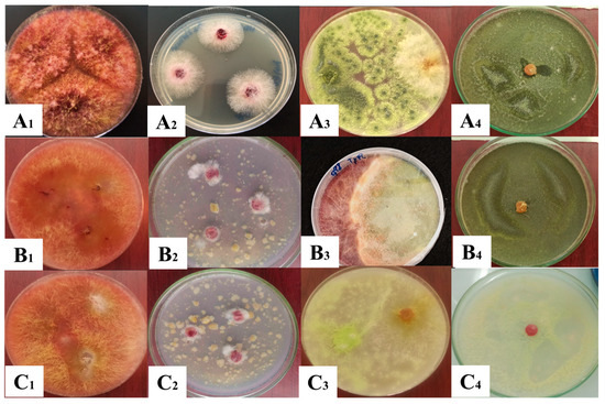 (A1–A4) Assays on potato dextrose agar media (image A1 also shown in Figure 1A), (B1–B4) on soft wheat agar media aw 0.98, and (C1–C4) on soft wheat agar media aw 0.95 (1: Fusarium culmorum control, 2: filtrate assay, 3: direct confrontation assay, 4: direct confrontation (Talaromyces pinophilus was cultivated 2 days before F. culmorum)).