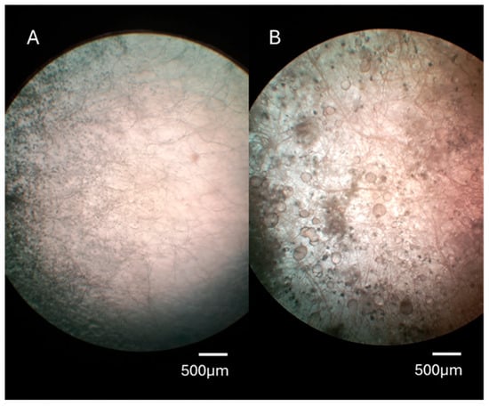 The microscopic evaluation of F. culmorum in contact with T. pinophilus is represented in Figure 4. The microscopical visualisation showed a denser mycelium from F. culmorum in the confrontation zone with the BCA (Figure 4B) with respect to the normal growth of the pathogen (Figure 4A). Furthermore, there was an increase in the exudate droplet production by the toxigenic mould when confronted with the BCA (Figure 4).