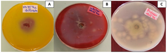 Talaromyces pinophilus HD25G2 production of extracellular enzymes on selective solid medium. Positive enzymatic activity indicated by a change in colour of the medium around the colony. (A): chitinase activity; (B): cellulase activity; (C): protease activity.