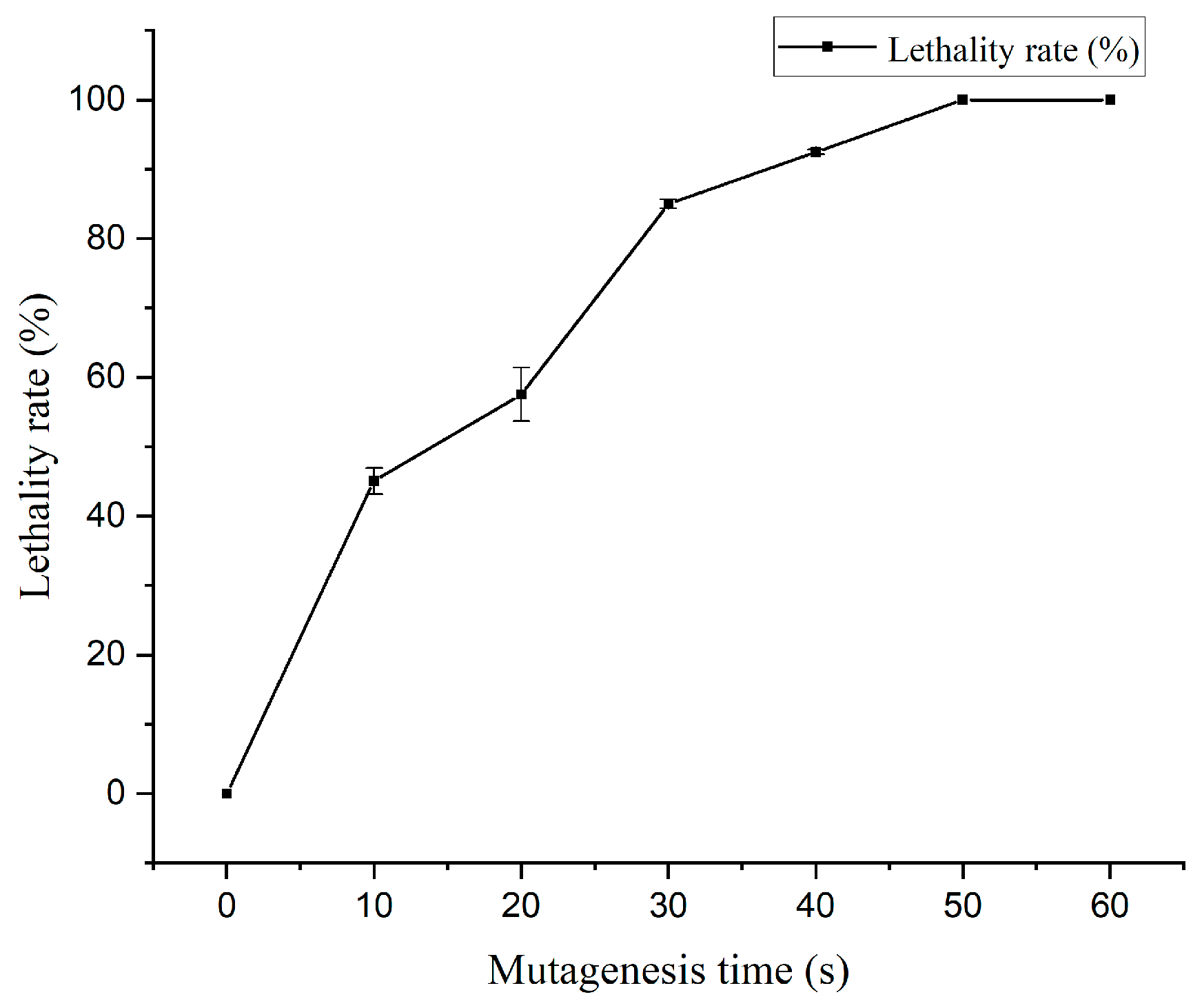 Figure 1. Effect of ARTP mutagenesis time on lethality rate. Each treatment contained three replicates.