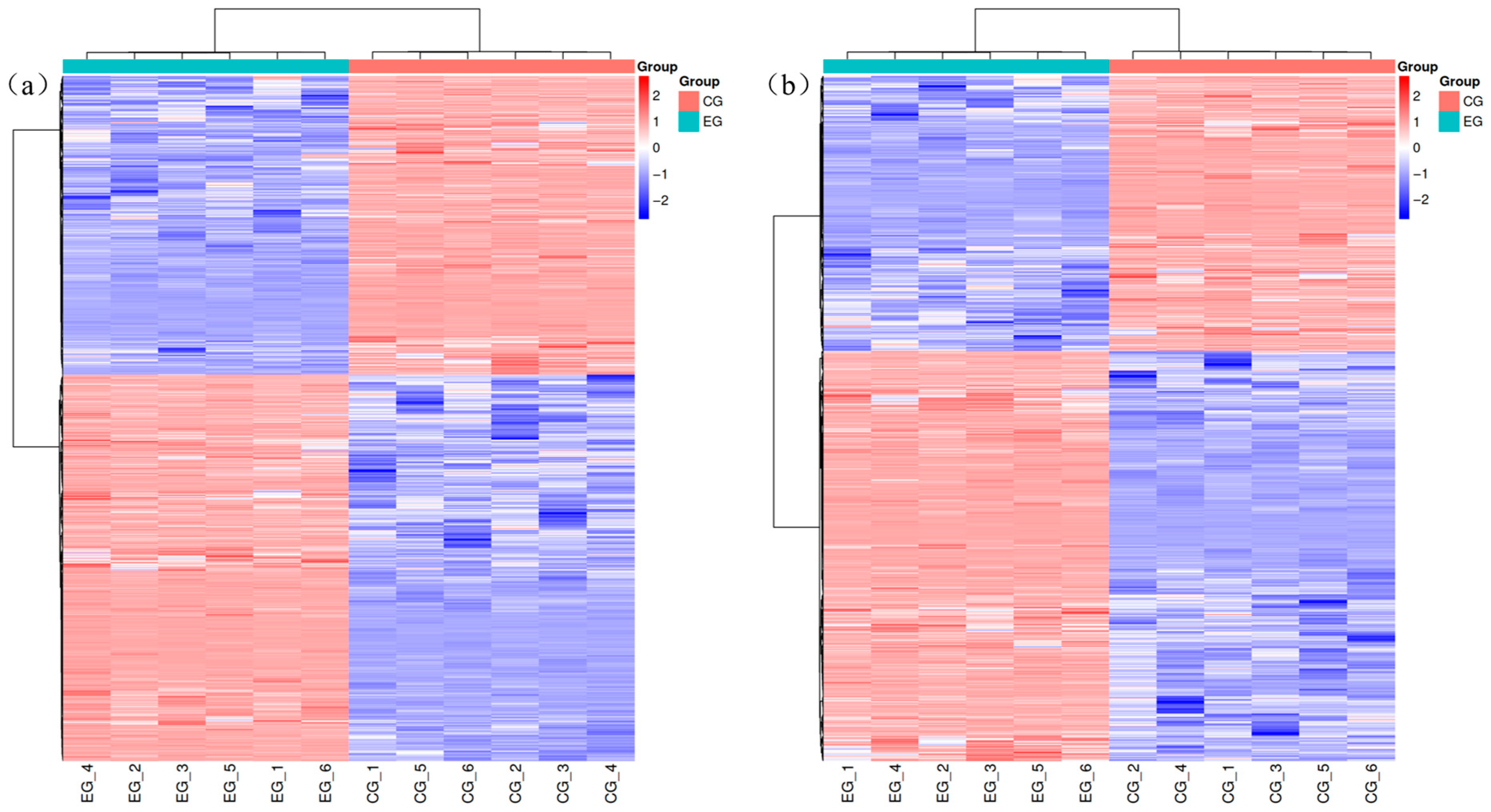 In the positive ion mode (Figure 3a), the upper-right red cluster signifies a higher metabolite abundance in the CG group than in the EG group, whereas the lower-left red cluster indicates an elevated abundance in the EG group. In the negative ion mode (Figure 3b), the upper-left red cluster highlights higher metabolite levels in the CG group, whereas the lower-left red cluster shows dominance in the EG group. These findings demonstrate the marked differences in the metabolic profiles between the CG and EG under identical cultivation conditions.