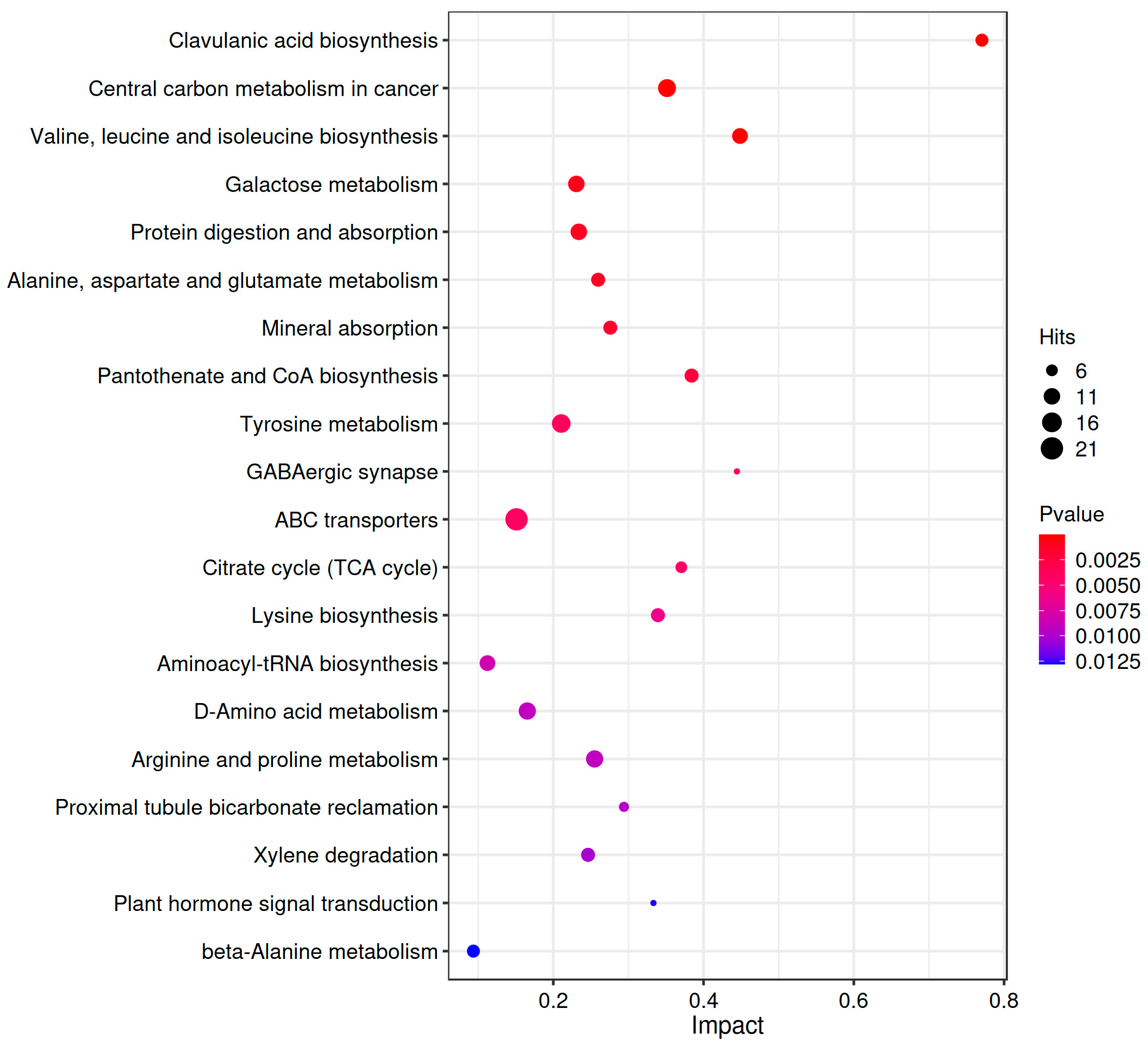 Figure 4. KEGG enrichment pathway. In the bubble plot, each bubble represents a metabolic pathway. The horizontal position and size of each bubble indicate the magnitude of the impact factor for that pathway in the topological analysis, with larger size corresponding to a larger impact factor. The vertical position and color of each bubble represent the p-value from the enrichment analysis (−log10 p-value), where a darker color indicates a smaller p-value and a more significant level of enrichment.