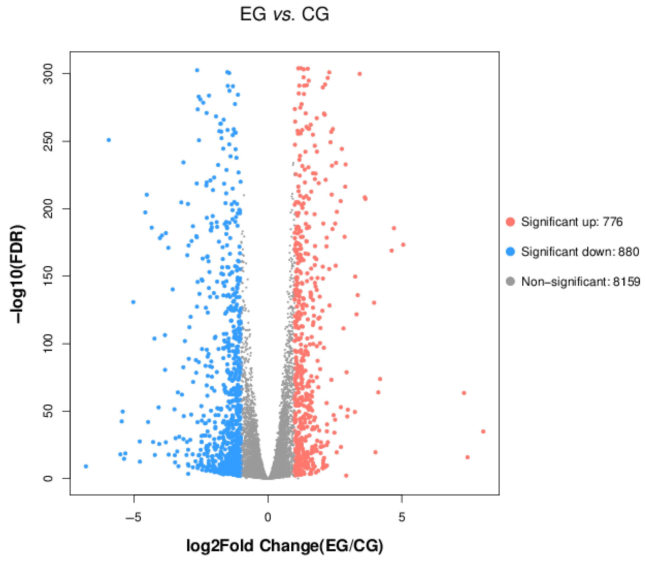 Figure 7. Differential metabolic volcano plot. CG represents the parent strain, while EG represents the fused strain. Red points represent significantly upregulated genes; blue points represent significantly downregulated genes; the gray area represents insignificant genes.