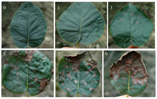19. Huang, X.L.; Cui, Y.L.; Xu, J.; Zhu, Y.H.; Chen, H.B.; Chang, X.L.; Yang, J.Z.; Gong, G.S. Resistance evaluation of kiwifruit germplasm materials to brown leaf spot caused by Corynespora cassiicola. Acta Phytopathol. Sin. 2018, 48, 711–715. [Google Scholar]