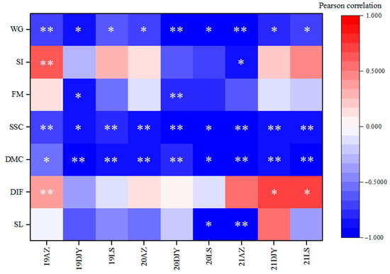 Figure 2. The correlation analysis between disease index and each fruit-quality index in trials over three years and three regions. WG: weight of individual fruit; SI: shape index; FM: firmness; SSC: soluble solids content; DMC: dry matter content; DIF: disease incidence of fruit rot; SL: shelf life. AZ: Anzhou region; DJY: Dujiangyan region; LS: Lushan region. Data are analyzed by Pearson correlation (* and ** indicate p < 0.05 and 0.01, respectively).
