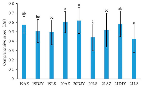 Figure 3. Comprehensive evaluation of fruit quality in three regions and three years. AZ: the Anzhou region; DJY: the Dujiangyan region; LS: the Lushan region. The letters on the columns indicate significant differences (p < 0.05) within each site according to Duncan’s new multiple-range test. Error bars represent standard error.