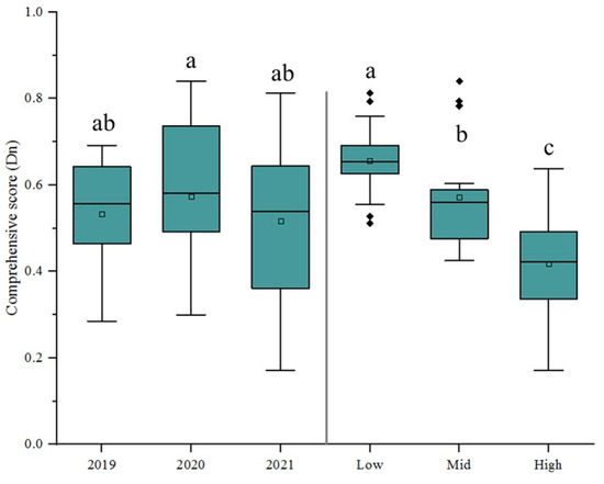 In this study, the scores of each plot were calculated based on the eigenvectors of each principal component, and then the contribution was used as the weight to calculate the cumulative sum of the product of the scores of the first three principal components of each plot and their respective weights to obtain the comprehensive score Dn. According to Figure 3, the comprehensive score of the Dujiangyan region in 2020 was the highest, whereas that of the Lushan region in 2021 was the lowest. There were no significant differences in comprehensive score of the same region in different year. The fruit quality of kiwifruit was the highest in 2020, followed by 2019, and was the worst in 2021 (Figure 4). There were significant differences in the comprehensive scores among different disease levels, and fruit quality was significantly reduced with the occurrence and epidemic of kiwifruit brown spot.