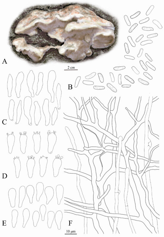 Dichomitus squalens: (A) Macroscopic characteristics. (B) Basidiospores. (C) Cystidia. (D) Basidia. (E) Basidioles. (F) Vegetative hyphae and Generative hyphae. Scale bar: 2 cm (A), 10 μm (B–F).