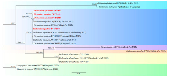 Phylogenetic tree of the Dichomitus. The best tree from the ML and Bl analysis of the nrITS + TEF1-a dataset. The two values of internal nodes, respectively, represent the maximum likelihood bootstrap (MLBP)/Bayesian posterior probability (BIPP). This study species is in bold and red font [27,28,29,30,31,32].