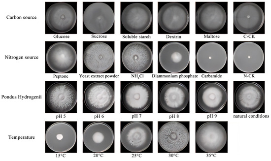The medium for the single-factor experiment on nitrogen sources comprised 20 g/L of the tested nitrogen source, 20 g/L of glucose, 3 g/L of potassium dihydrogen phosphate, 1.5 g/L of magnesium sulfate, and 20 g/L of agar, with the pH left unadjusted. The control group medium was identical, except for the omission of the tested nitrogen source.